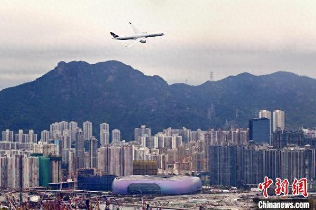 3月30日下午,国泰航空有限公司(简称“国泰航空”)安排一架客机低飞越过维多利亚港,掠过启德体育园附近上空,以纪念旧启德机场启用100周年。图为国泰航空客机在启德体育园上空飞过。中新网发 国泰航空有限公司 供图